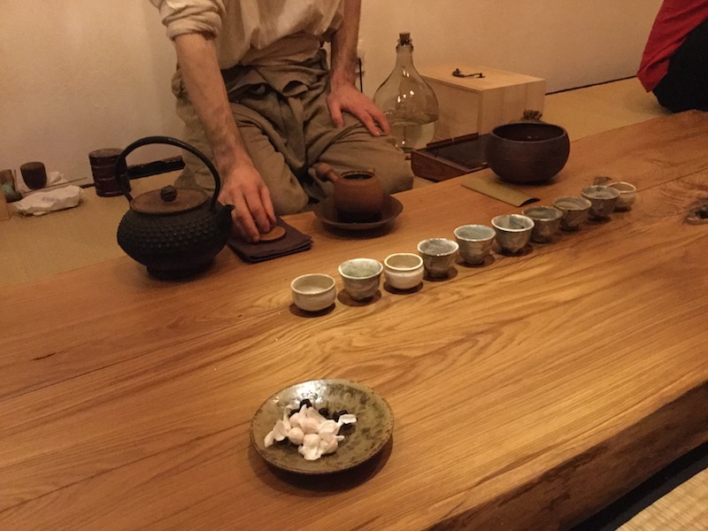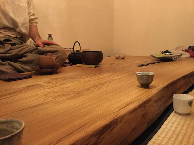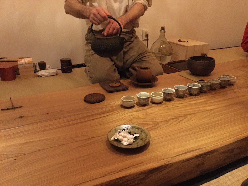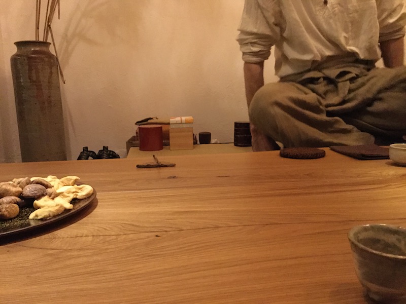 The whole space is about 4×8 meters large/small room – on one side is a display of beautiful teapots (Tomas is perhaps too much of an avid collector), in the other 2 thirds is a large solid wood tea table and a tiny tatami seating area for about 8 tea lovers.